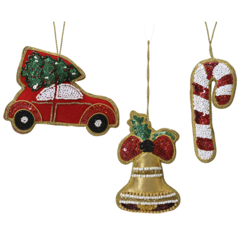 Voeg deze met kralen versierde kerstboomdecoratie toe voor een weelderige uitstraling. Deze hangdecoratie met kralen heeft een mooie warme klassieke kleuren en is versierd met pailletten en kralen. Door deze pailletten en kralen geef je de kerstdecoratie op een subtiele manier toch een beetje glitter en glamour. Verkrijgbaar in een kerstklok, auto en zuurstok.