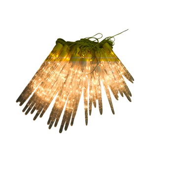 IJspegel kerstverlichting voor buiten (kan natuurlijk ook voor binnen) met 32 ijspegellampjes en wit snoer. Uitermate geschikt voor gevel- en dakranden. Breedte 5 meter met 8 meter aanloopsnoer en 24 volt transformator. Met KemaKeur.