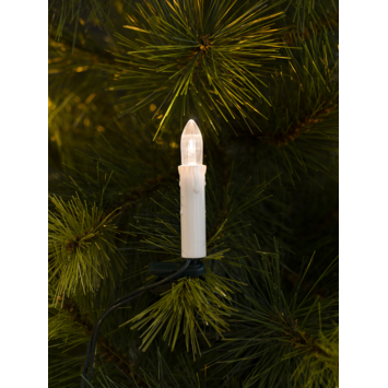 LED Boomkaarsensnoer, 15 druipkaarsen, 5.6m, pizello met kap, luxe knijper, kogelgewricht, spacing 40cm, aansluitsnoer 1.5m, groene kabel, verwisselbare lampjes, 230V, binnen