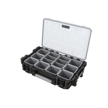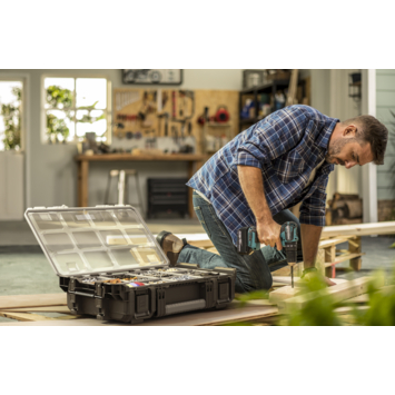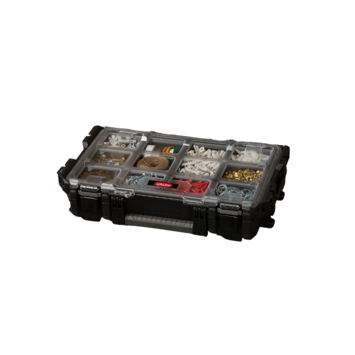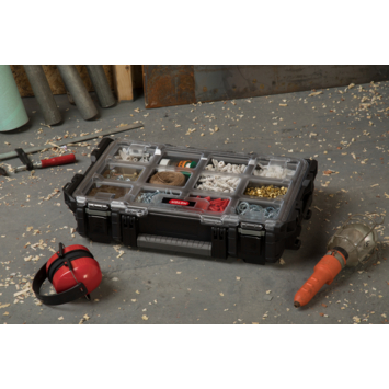 De Keter Pro Gear assortimentsdoos biedt een handige manier om kleine onderdelen en accessoires te organizeren, op te slaan en te vervoeren van de ene plaats naar de andere. Het transparante deksel geeft een glimp van de inhoud, waardoor de organizer niet meer hoeft te worden geopend om de inhoud te controleren. Gemaakt met 3 handvaten: 2 aan de zijkant en 1 centraal handvat. De sorteerdoos kan afzonderlijk worden gebruikt, gestapeld met meerdere organizers, of worden vastgemaakt aan de Pro Gear Mobiele Gereedschapskist voor een perfecte opbergoplossing voor iedere behoefte.