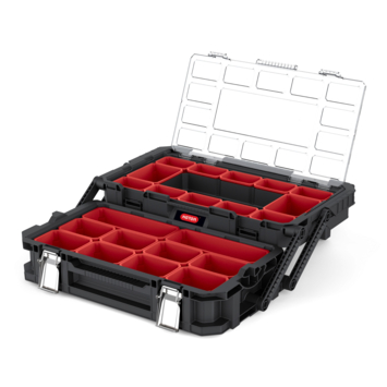 Een natuurlijke keuze voor professionals en weekendstrijders die gemakkelijk toegang willen hebben tot al hun gereedschap en accessoires. Deze compacte maar zeer robuuste organizer is voorzien van een handig 2-traps systeem met tal van multi-grootte uitneembare bakken. Wanneer deze is opengeklapt zijn alle gereedschappen in een oogopslag te zien door de stevige transparante deksel. Wil je dit toevoegen aan het Connect rolsysteem? Gemakkelijk. Stapel het gewoon op. Klik erop. En je bent klaar om te gaan.