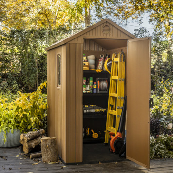 Ben je op zoek naar een kast voor het balkon, in de tuin of garage? De Keter Darwin 46 bruin woodlook is een kunststof kast met een houten look uit de Keter kunststof tuinhuizencollectie. Deze Keter tuinkast is de perfecte oplossing voor het opbergen van gereedschap, tuingereedschap, tuinkussens en andere tuinaccessoires. Zo zorgt de openslaande deur voor een makkelijke toegang en kunnen er op het stevige vloerpaneel zwaardere spullen als barbecues en tuingereedschap opgeslagen worden. En mocht je spullen hebben waarvan je niet wilt dat bijvoorbeeld je kinderen erbij kunnen, dan zijn de deuren af te sluiten met een slot (niet inbegrepen). Na levering kan de Keter Darwin 46 kunststof opbergkast direct worden opgebouwd, mits een vlakke ondergrond is voorbereid. Twee personen zijn er ongeveer 2-3 uur mee bezig om het Keter huisje op te bouwen.