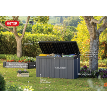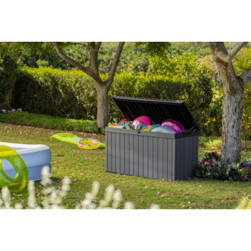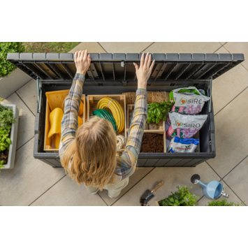 De Keter Darwin opbergbox tuin antraciet 570 liter helpt je om tuinkussens, speelgoed en gereedschap netjes op te bergen. Met 570 liter inhoud heb je voldoende ruimte om spullen uit het zicht te bewaren, zodat je tuin of terras rustig oogt.