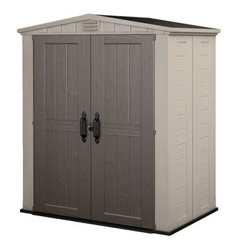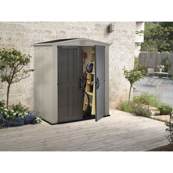 Het Factor 63 tuinhuis van Keter is gemaakt van duurzaam kunststof en is verstevigd met aluminium profielen. De schuin aflopende vloer zorgt samen met de brede deur voor een eenvoudige toegang tot het kunststof huisje. De deur is afsluitbaar met een hangslot (niet inbegrepen). Om ervoor te zorgen dat de binnenkant van het tuinhuisje Factor 63 niet te vochtig wordt is het speciaal voorzien van ventilatie roosters. Na levering kan het Keter Factor 63 kunststof tuinhuis direct worden opgebouwd, mits een vlakke ondergrond is voorbereid. Twee personen zijn er ongeveer 2-3 uur mee bezig om het Keter huisje op te bouwen. Kortom het Factor 63 tuinhuis van Keter is ideaal om fietsen, scooters, tuinmeubelen, kinderspeelgoed en tal van andere spullen in op te bergen.