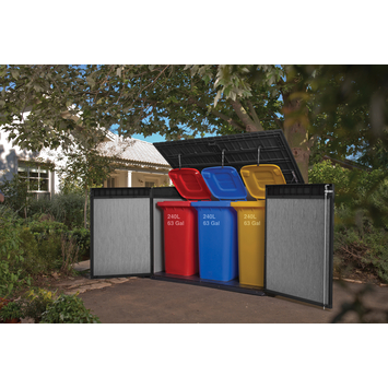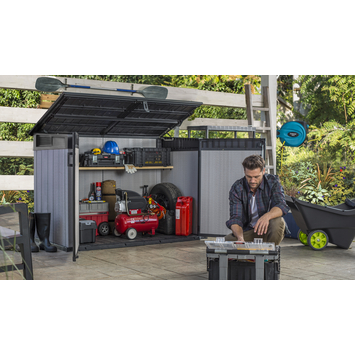De Grande Store heeft dankzij het unieke Duotech™ materiaal de uitstraling van echt hout. De voordelen van kunststof blijven behouden, de berging is dus onderhoudsvrij en weerbestendig. De breed openslaande deuren, het deksel met gasveren en de hellende drempel geven eenvoudige toegang tot de berging. Het product kan naar wens aangepast worden, zo kunnen er eenvoudig planken gemonteerd worden en kun je de wanden overschilderen. De berging is ideaal voor het opbergen van bijvoorbeeld twee 360 liter containers of drie 240 liter containers. De deuren zijn afsluitbaar met slot voor extra veiligheid.