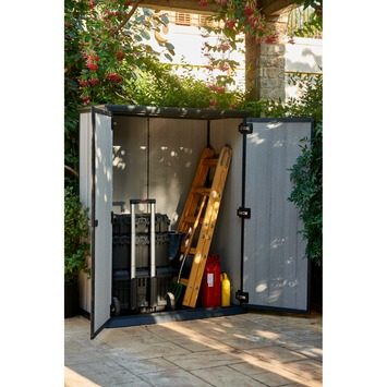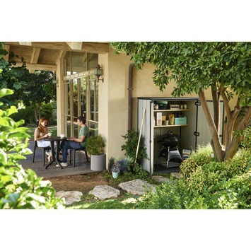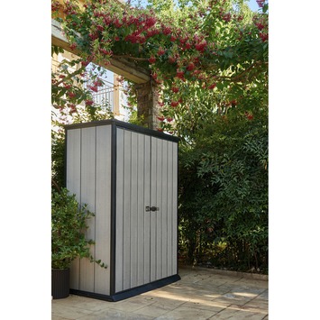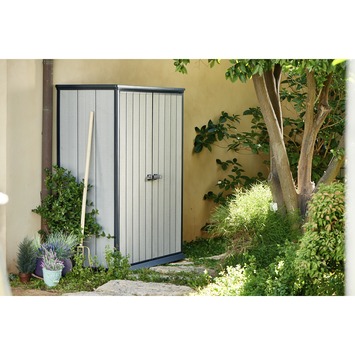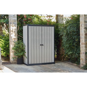 Ben je op zoek naar een kast voor het balkon, in de tuin of garage? De Keter High Store Tuinopbergkast is een kunststof kast met een houten look uit de Keter kunststof tuinhuizencollectie. Deze Keter tuinkast is de perfecte oplossing voor het opbergen van gereedschap, tuingereedschap, tuinkussens en andere tuinaccessoires. Zo zorgen de twee openslaande deuren en de hellende drempel voor een makkelijke toegang en kunnen er op het stevige vloerpaneel zwaardere spullen als barbecues en tuingereedschap opgeslagen worden. En mocht je spullen hebben waarvan je niet wilt dat bijvoorbeeld je kinderen erbij kunnen, dan zijn de deuren af te sluiten met een slot (niet inbegrepen). Na levering kan de Keter High Store kunststof opbergkast direct worden opgebouwd, mits een vlakke ondergrond is voorbereid. Twee personen zijn er ongeveer 2-3 uur mee bezig om het Keter huisje op te bouwen.