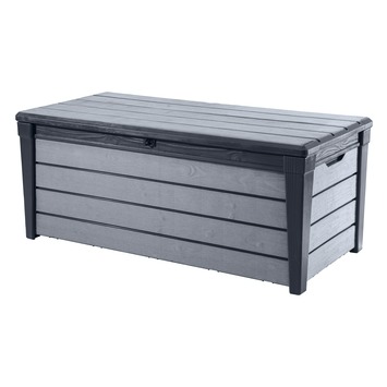 De Keter kussenbox Brushwood antraciet is met de uitstraling van hout geschikt als opbergartikel in jouw tuin. Door het volume van 455 liter kun je met gemak jouw tuinkussens, speelgoed of andere tuinspullen opbergen in deze box. Door een automatisch openingsmechanisme kan de deksel gemakkelijk gedempt openen of sluiten. Door de verstevigde deksel kan de kussenbox zelfs als zitje voor 2 personen worden gebruikt. De keter kussenbox brushwoord antraciet heeft een afmeting van 60,3 centimeter hoog, 145 centimeter breed en 69,7 centimeter diep.