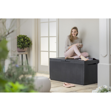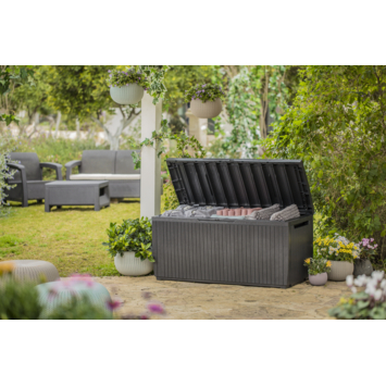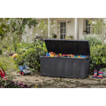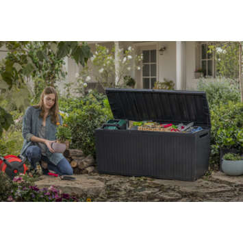 De Keter opbergbox Springwood antraciet is een decoratieve opbergbox met een houtuitstraling. Door het volume van 305 liter kun je met gemak tuinkussens of andere tuinspullen opbergen in deze box. De opbergbox is gemakkelijk zonder gereedschap in elkaar te zetten. De Keter opbergbox Springwood is gemaakt van hoogwaardig kunststof waardoor het niet zal gaan rotten of roesten. De box heeft dus nauwelijks onderhoud nodig. De Keter opbergbox Springwood is 57 centimeter hoog, 123 centimeter breed en 53,5 centimeter diep.