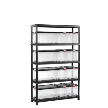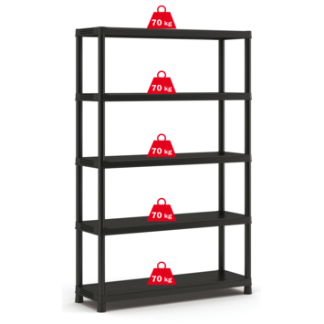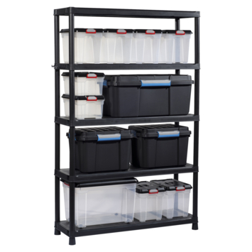 Een opgeruimde werkplek begint met de Keter Plus stellingkast. Dit stijlvolle zwarte opbergrek oogt strak en professioneel, waardoor het perfect past in een moderne garage, schuur of hobbyruimte. De kunststof constructie is niet alleen stevig, maar ook bestand tegen vocht. Handig als je de kast in een onverwarmde ruimte gebruikt. De vijf royale planken bieden volop ruimte voor gereedschap, verfblikken of schoonmaakmiddelen. Elke plank heeft een draagvermogen van 70 kilo, ondersteund door een metalen versteviging. Je zet het rek in een paar minuten in elkaar, zonder gereedschap. Voor extra zekerheid kun je het aan de muur bevestigen. Een nette, overzichtelijke ruimte is binnen handbereik.