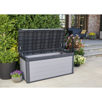 - Ruime opslag van 570 liter voor tuinkussens en accessoires