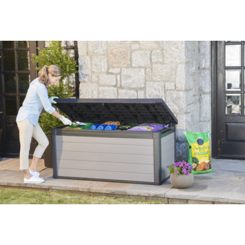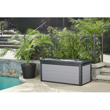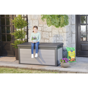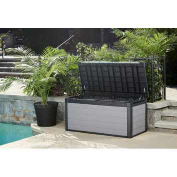 Met de Keter Premier opbergbox 570 liter houd je jouw tuin netjes en overzichtelijk. De box is gemaakt van DUOTECH™, een kunststof dat goed tegen regen en zon kan, zonder te roesten, schilferen of verkleuren. Dankzij de inhoud van 570 liter is er genoeg ruimte voor bijvoorbeeld tuinkussens of barbecue-spullen. De klep opent makkelijk met een automatisch mechanisme, en je kunt er een slot aan toevoegen (niet inbegrepen) om je spullen veilig op te bergen. De rustieke houtlook en grijze kleur passen goed in elke tuin of op elk terras.