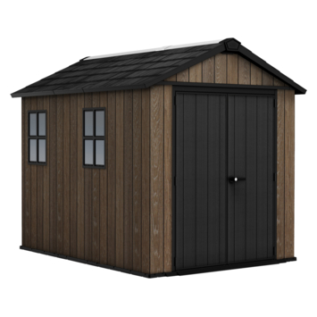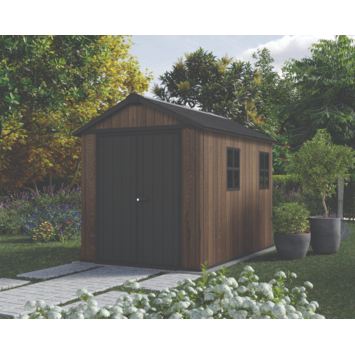 Het Keter Signature 759 tuinhuis 287 x 230 x 246 cm heeft een klassieke puntdakvorm die in vrijwel elke tuin past. De DECoCOAT panelen geven het oppervlak een houtlook met zichtbare structuur, terwijl het materiaal van kunststof is. Zo behoud je de uitstraling van hout zonder onderhoud.