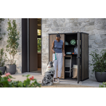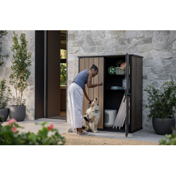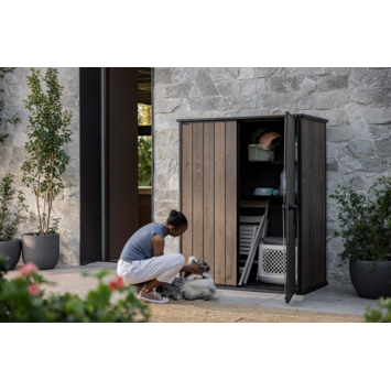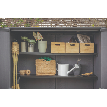 Met deze tuinkast van Keter houd je je tuin overzichtelijk en alles binnen handbereik. De Signature opbergkast is gemaakt van stevig kunststof dat geen vocht opneemt, onderhoudsvrij is en niet afbladdert. Daardoor blijft de kast netjes, terwijl het een mooie houtlook nabootst. De kast heeft twee afsluitbare deuren (slot niet inbegrepen) die naar buiten opengaan. Binnenin vind je een royale opbergruimte van 130,8 cm breed, 66,2 cm diep en 164,4 cm hoog. Ruim genoeg voor tuingereedschap, potgrond of een set kussens. De wandpanelen zijn verstevigd met ribben, waardoor de kast stevig blijft staan, ook als je ‘m goed vult. De warme walnut kleur en houtstructuur geven de kast een natuurlijke uitstraling, terwijl het kunststof eenvoudig schoon te houden is. Buitenmaat: 140 x 73,6 x 170,4 cm.
