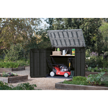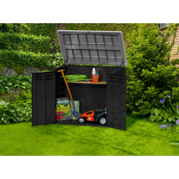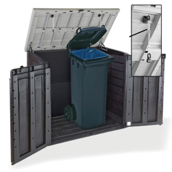 Via de dubbele deuren en het deksel pak je makkelijk wat je nodig hebt. De gasveren zorgen ervoor dat het deksel soepel opent en sluit. De berging is afsluitbaar met een hangslot (niet inbegrepen) voor extra zekerheid.