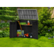 De kunststof panelen hebben een houtstructuur en zijn eenvoudig schoon te maken. Het materiaal is UV-bestendig en regenwaterdicht en geschikt voor buitengebruik. De opbergbox wordt geleverd als bouwpakket.