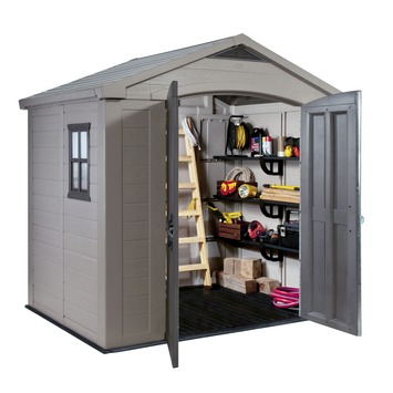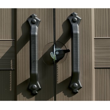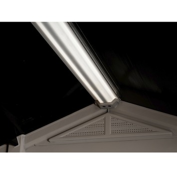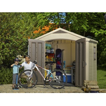 Zoek je een onderhoudsvrij tuinhuis waar je jarenlang plezier van hebt? De Keter Factor 86 is gemaakt van stevig kunststof met aluminium versteviging. Het materiaal rot niet, deukt niet en roest niet. Je zet dit huisje op met z’n tweeën in een middag. Het slimme ontwerp met dubbele deuren en schuin aflopende vloer maakt het verplaatsen van zware spullen eenvoudig. Fietsen, gereedschap, kussens, speelgoed of meubels: alles blijft schoon dankzij de bijgeleverde vloer. Binnen is verrassend veel licht door het zijraam en de lichtstrook in het dak. De binnenruimte is bijna 2,4 meter hoog, dus ook voor grote spullen geschikt.