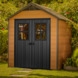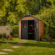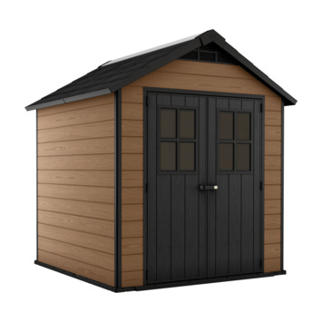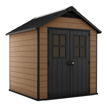 Op zoek naar een compacte onderhoudsvrije berging voor in je tuin? Het Keter Newton 757 Maghony bruin kunststof Tuinhuis 228x224x252 cm (BxDxH) biedt een compacte, uit de Keter kunststof tuinhuizen collectie, oplossing voor opslag van tuingereedschap, barbecues, tuinaccessoires, kinderspeelgoed en tal van andere spullen. Deze berging past met zijn houtlook past uitstekend in een natuurlijke omgeving. Een ingebouwd ventilatiepaneel zorgt ervoor dat er in dit tuinhuisje een constante toevoer van lucht is en beschermt meteen tegen de schadelijke effecten van schimmels. Het bijgeleverde vloerpaneel zorgt voor een stabiele, schone en vochtvrije basis. Na levering kan het Keter Woodshield 757 kunststof tuinhuisje direct worden opgebouwd, mits een vlakke ondergrond is voorbereid. Twee personen zijn er ongeveer 2-3 uur mee bezig om het Keter huisje op te bouwen. Dit tuinhuis van het merk Keter biedt een stevige, onderhoudsvrije oplossing om je spullen in je tuin op te bergen.