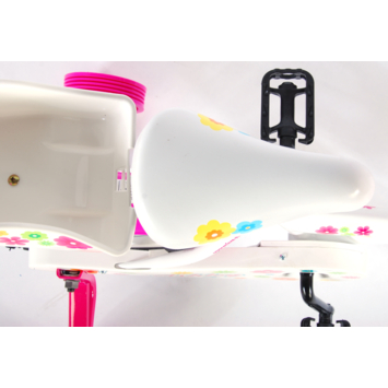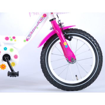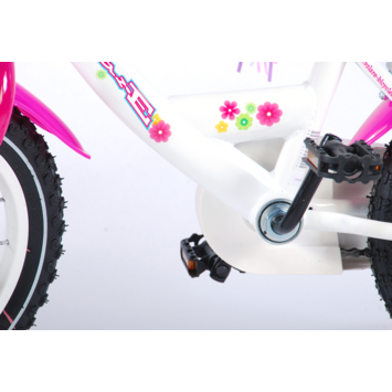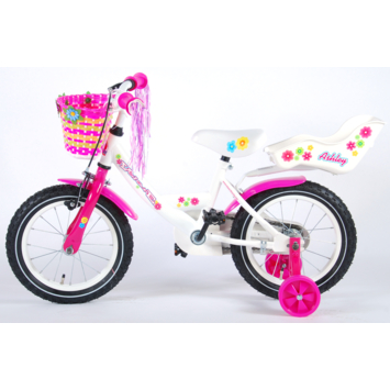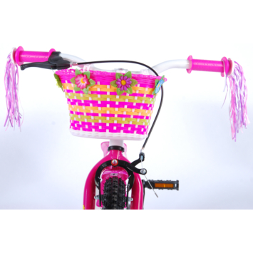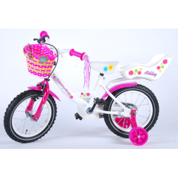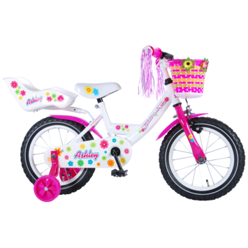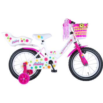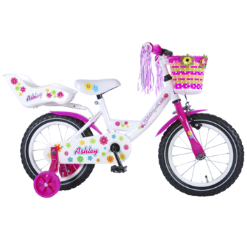 Volare Ashley meisjesfiets 14 inch. De Volare Ashley fietsen zijn geschikt voor alle fleurige dametjes. Zowel het frame van de fiets als het praktische kunststofmandje zijn voorzien van een prachtig bloemetjesdesign. De fiets beschikt over makkelijk afneembare zijwieltjes om snel te kunnen leren fietsen, een stevige handrem en een achteruittraprem. Bovendien heeft de fiets een poppenzitje, zodat ieder dametje haar pop veilig kan vervoeren en zelf haar handjes aan het stuur kan houden. Een top fiets voor een lage prijs! Deze fiets is voor 95% afgemonteerd, dus bijna fietsklaar. Wel zo gemakkelijk!