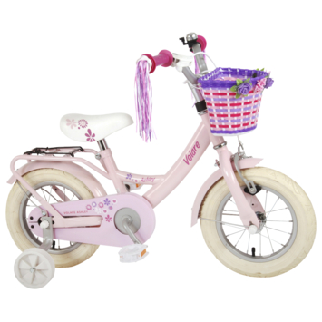 Volare Ashley 12 inch meisjesfiets. Deze beeldige Volare Ashley fiets is dé fiets die ieder meisje wil hebben. De achterdrager is geïntegreerd in het frame, waardoor de fiets een strak en modern uiterlijk heeft. Op deze achterdrager en in het fietsmandje kunnen alle belangrijke spulletjes mee worden genomen, waardoor uw kindje veilig de handjes aan het stuur kunnen houden. Met de handrem en terugtraprem kan de vaart worden verminderd. Het zachte zadel en de handvaten zorgen voor extra comfort en ter bescherming van de kleine vingertjes is de kettingkast gesloten. Met de fietsbel kun je iedereen laten weten dat je de hoek om komt. De afneembare zijwieltjes zorgen ervoor dat deze fiets een ideale fiets is om snel en goed te kunnen leren fietsen. De 12 inch luchtbanden van deze Volare Ashley fiets zorgen ervoor dat de fiets geschikt is voor meisjes tussen de 3 en 4.5 jaar oud met kledingmaat 92-104. Bovendien is de fiets voor 95% afgemonteerd, dus bijna fietsklaar. Wel zo gemakkelijk!