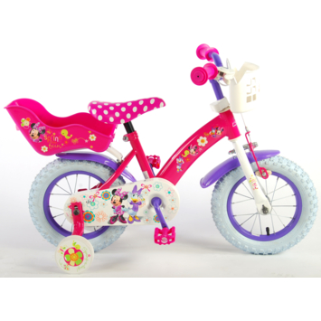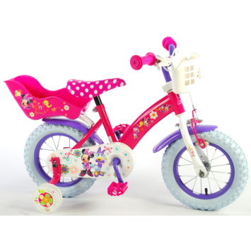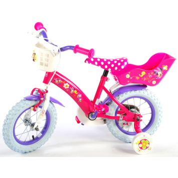 Disney Minnie Bow-Tique kinderfiets 12 inch. De Disney Minnie Mouse Bow-Tique meisjesfiets is onder alle meisjes uiterst gewild. Wij hebben een prachtige Minnie Bow-Tique fiets ontworpen in de prachtige kleurstelling roze. De fiets heeft een poppenzitje achter en een kunststof mandje voor, zodat ieder meisje haar spulletjes mee kan nemen maar haar handjes veilig aan het stuur kan houden. Verder heeft de fiets ter bescherming van de kleine vingertjes een gesloten kettingkast. Ook is de fiets voorzien van een handrem en een terugtraprem en frisse witte bandjes met metalen velgen. Om snel te kunnen leren fietsen heeft de fiets twee afneembare zijwielen. Welk meisje wil deze fiets nu niet? Official Licensed Disney Product.