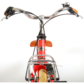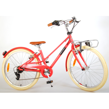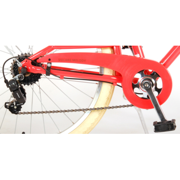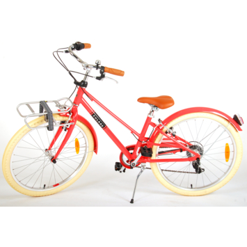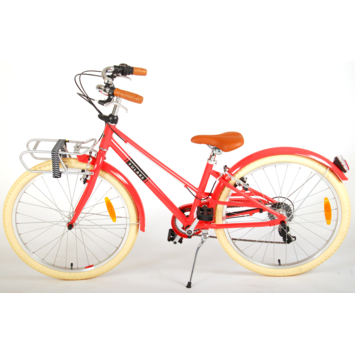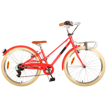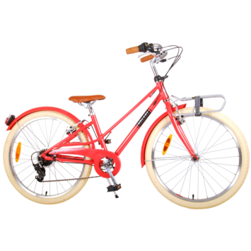De prachtige kinderfiets Melody is van superieure kwaliteit. Het frame van deze fiets is gemaakt van ultra licht aluminium, slechts 13,5 kilo! Deze fiets met dit moderne frame, de stoere pistol type kettingkast en praktische voordrager is een must have voor iedere hippe meid. De fiets beschikt over 6-speed versnellingen. Om vaart te kunnen minderen heeft de fiets een veilig Aluminium V-brake systeem met twee handremmen. De fiets heeft een sterk standaard. De handvaten zijn van Kraton, een heerlijk zacht rubber, waardoor deze lekkerder in de hand liggen en extra comfort bieden. De zadelbuis is extra laag met een extra lange zadelpen, waardoor de fiets met uw kind mee kan groeien. Daarnaast heeft de fiets een aluminium smart control systeem, dat ervoor zorgt dat het stuur begrensd is (niet in hoogte verstelbaar). Bovendien heeft de fiets voor- en achterverlichting. De fiets is voor 85% afgemonteerd. De 24 inch luchtbanden maken dat deze fiets geschikt is voor meiden tussen de 8 en 10 jaar oud met kledingmaat 128-140. Op deze hippe kinderfiets Melody wil iedere meid naar school fietsen!