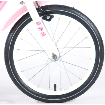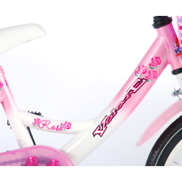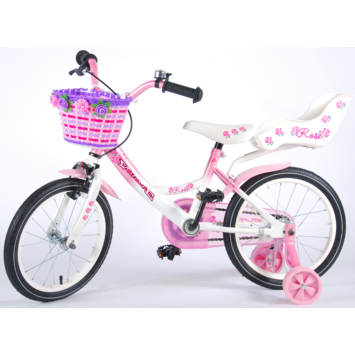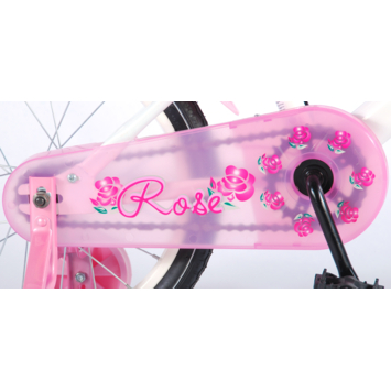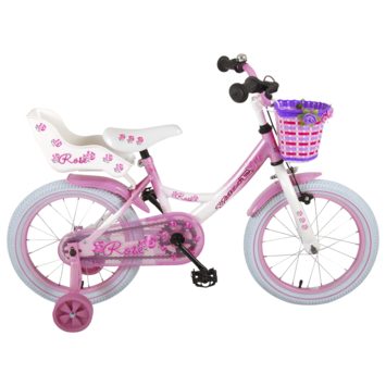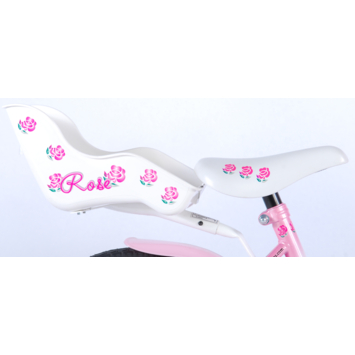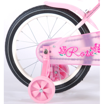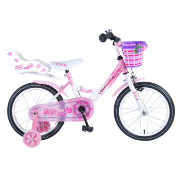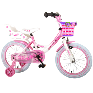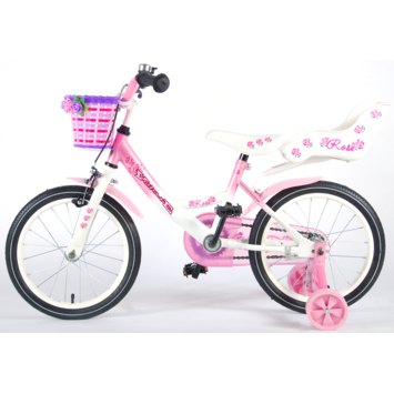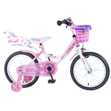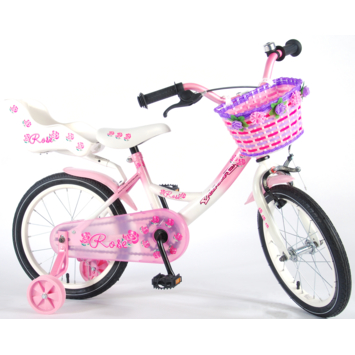Volare Rose 16 inch meisjesfiets. Deze mooie Volare Rose fiets is een echte meisjesfiets. In prachtige kleurstelling roze met een meisjesachtig bloemetjesdecor. De fiets is voorzien van een sterk en modern frame, afneembare zijwieltjes om snel te kunnen leren fietsen, een fietsbel en een krachtige hand- en terugtraprem. Bovendien heeft de fiets een poppenzitje en een handig mandje, zodat ieder meisje haar poppen en andere spulletje overal mee naar toe kan nemen, maar tegelijkertijd haar handjes wel veilig aan het stuur kan houden. Deze fiets is een ideale fiets om op naar school en vriendinnetjes te fietsen! Welk meisje wil deze fiets nu niet? Deze fiets is voor 95% afgemonteerd, dus bijna fietsklaar. Wel zo gemakkelijk!