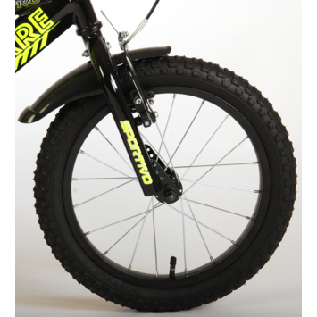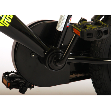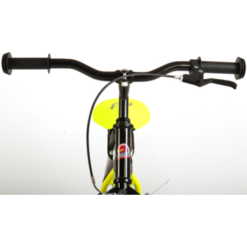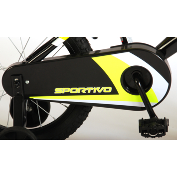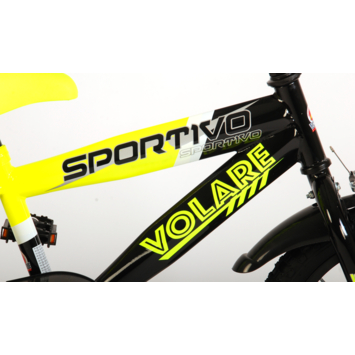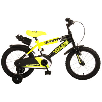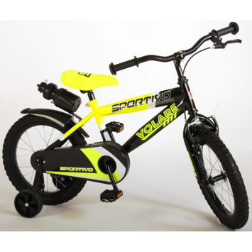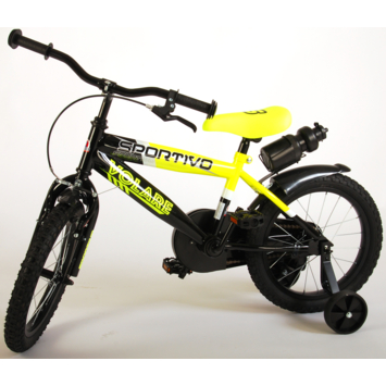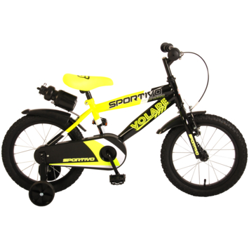 Volare Sportivo 16 inch kinderfiets. Het sterke stalen frame heeft met de stoere neon geel met zwarte kleurstelling een zeer sportieve uitstraling. Met de bidon in de praktische bidonhouder heeft uw kind altijd iets te drinken bij zich. De spatborden houden al het opspattend vuil tegen. Om vaart te minderen heeft de fiets zowel een hand- als terugtraprem. Ter bescherming van de kleine vingertjes is de kettingkast gesloten. Om snel te kunnen leren fietsen heeft de fiets afneembare zijwielen. De 16 inch luchtbanden maken de fiets geschikt voor stoere knullen tussen 4 en 6 jaar oud met kledingmaat 104-110. Bovendien is de fiets voor 95% afgemonteerd, dus bijna fietsklaar. Wel zo gemakkelijk!