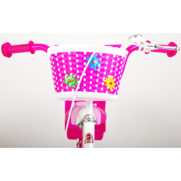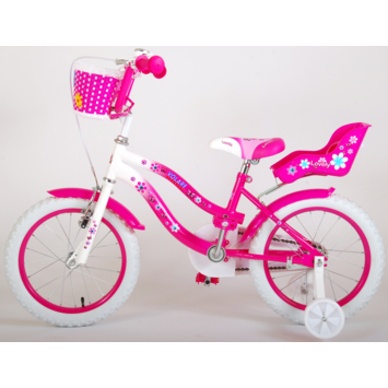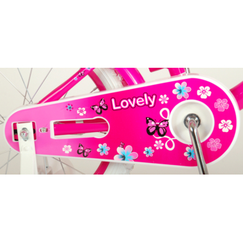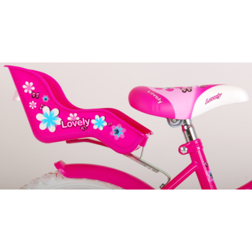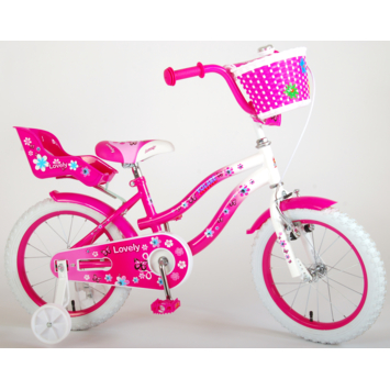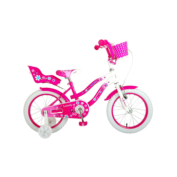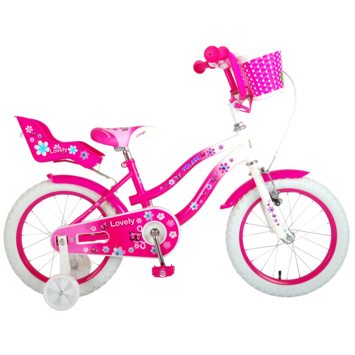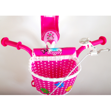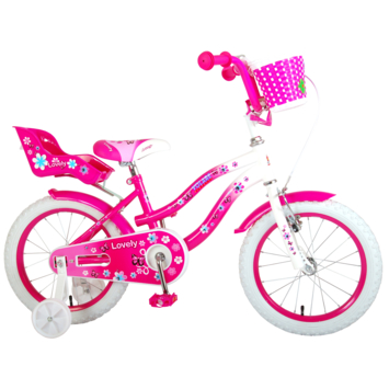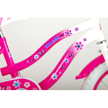 Volare Lovely 16 inch kinderfiets. De Volare Lovely 16 inch kinderfiets is dé fiets waar ieder meisje van droomt. De vlinders en bloemen op het frame, zadel en op de poppenzit maken het design van de roze fiets helemaal af. Om vaart te kunnen minderen heeft de fiets zowel een handrem als een terugtraprem. Ter bescherming van de kleine vingertjes heeft de fiets een gesloten kettingkast. Met de fietsbel kun je laten weten dat je de hoek om komt. Om spulletjes mee te kunnen nemen heeft de fiets een prachtig kunststof mandje en speciaal voor de poppen heeft de fiets een roze poppenzitje achter. Met de afneembare zijwieltjes kan ieder kind snel leren fietsen. De 16 inch luchtbanden maken de fiets geschikt voor kinderen tussen de 4 en 6 jaar oud met kledingmaat 104-110. Deze fiets is voor 95% afgemonteerd, dus bijna fietsklaar.