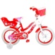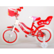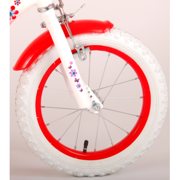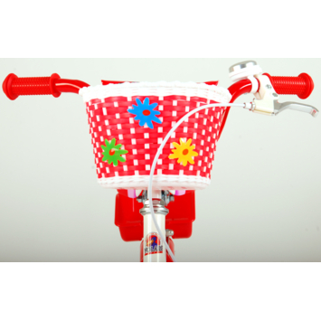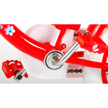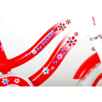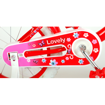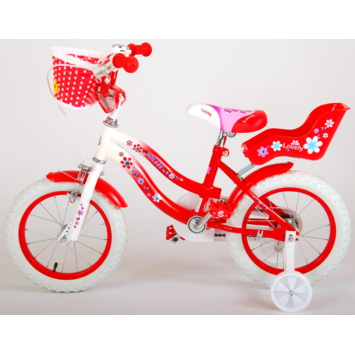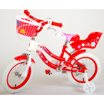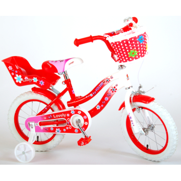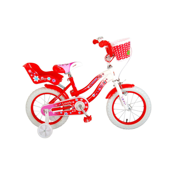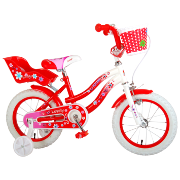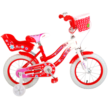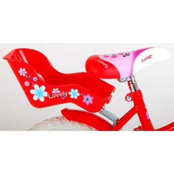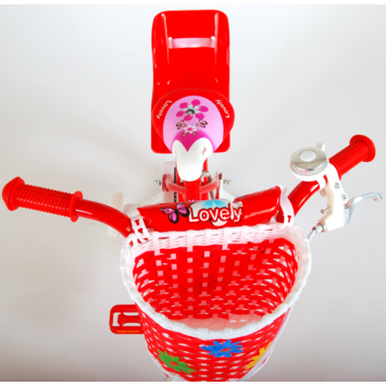 Volare Lovely 14 inch kinderfiets. De Volare Lovely 14 inch kinderfiets is dé fiets waar ieder meisje van droomt. De vlinders en bloemen op het frame, zadel en op de poppenzit maken het design van de rode fiets helemaal af. Om vaart te kunnen minderen heeft de fiets zowel een handrem als een terugtraprem. Ter bescherming van de kleine vingertjes heeft de fiets een gesloten kettingkast. Met de fietsbel kun je laten weten dat je de hoek om komt. Om spulletjes mee te kunnen nemen heeft de fiets een prachtig kunststof mandje en speciaal voor de poppen heeft de fiets een roze poppenzitje achter. Met de afneembare zijwieltjes kan ieder kind snel leren fietsen. De 14 inch luchtbanden maken de fiets geschikt voor kinderen tussen de 3.5 en 5 jaar oud met kledingmaat 98-110. Deze fiets is voor 95% afgemonteerd, dus bijna fietsklaar.