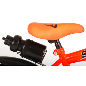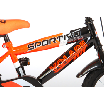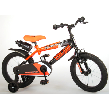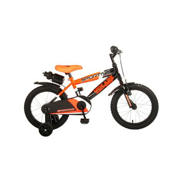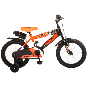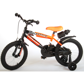 Volare Sportivo 16 inch kinderfiets. Het sterke stalen frame heeft met de stoere neon oranje met zwarte kleurstelling een zeer sportieve uitstraling. Met de bidon in de praktische bidonhouder heeft uw kind altijd iets te drinken bij zich. De spatborden houden al het opspattend vuil tegen. Om vaart te minderen heeft de fiets zowel een hand- als terugtraprem. Ter bescherming van de kleine vingertjes is de kettingkast gesloten. Om snel te kunnen leren fietsen heeft de fiets afneembare zijwielen. De 16 inch luchtbanden maken de fiets geschikt voor stoere knullen tussen 4 en 6 jaar oud met kledingmaat 104-110. Bovendien is de fiets voor 95% afgemonteerd, dus bijna fietsklaar. Wel zo gemakkelijk!