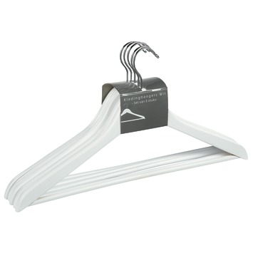De Kledinghanger 5 stuks zijn vijf wit gelakte houten kledinghangers voorzien van een broeklat. De kledinghangers zorgen ervoor dat jouw kledingstukken altijd netjes uitgehangen zijn. De broeklat is enorm handig om een pantalon, broek, jeans of rok op te hangen.