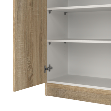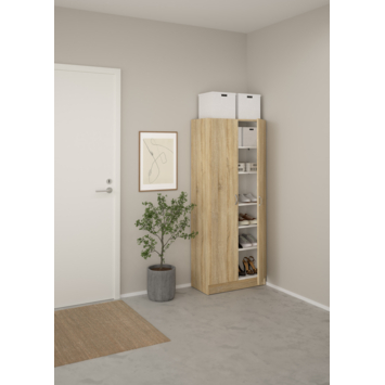De Fabian kast is gemaakt van spaanplaat en voorzien van een gelakte eiken afwerking. Deze warme tint geeft de kast een natuurlijke en tijdloze look. Het minimalistische design zorgt ervoor dat de kast eenvoudig te combineren is met andere meubels in huis.