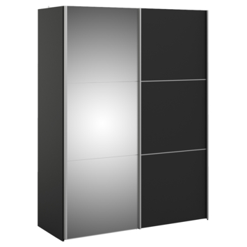 De kledingkast Janneke met de afmetingen (hxbxd) 202x152x64 cm is uitgevoerd in een zwarte kleur en een spiegeldeur. De kast heeft schuifdeuren en wordt standaard geleverd met een roede voor een hanggedeelte en legplanken. Het interieur van de kast is uit te breiden met legplanken en ladenblok om de kast geheel naar eigen wens in te delen. Voor de veiligheid raden wij aan de kast te bevestigen tegen de wand.