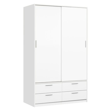 De Lennox is een mooie kast met een moderne look. De randen aan de voorkant van de kast zijn in een eiken kleur. Hierdoor krijgt de kast een speelse uitstraling. Met zijn 2 deuren en 4 lades heeft deze kast veel opbergruimte voor al je kleding. De kast heeft 2 roedes met daarboven 2 legplanken. Voor de veiligheid raden wij aan deze kast vast te zetten aan de muur.