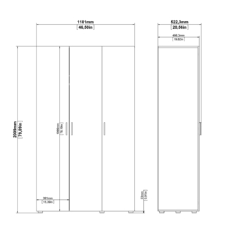 De kast is 2m hoog, 1.18m breed en 49.8cm diep.