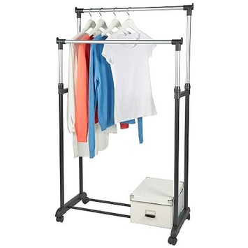 De Kledingrek op wielen is de trendy manier om kleding op te hangen. Niet meer in de kast, maar op een stabiel metalen dubbele kledingrek in je slaapkamer. Je kleding kun je dan, zonder dat dit in een te volle kast hangt met het risico van kreuken, direct aantrekken. Onderin dit rek kun je je bijpassende schoenen plaatsen. Bij dit dubbel kledingrek zijn beide roedes op ongelijke hoogte te plaatsen, zodat alle kleding vrij kan hangen. Het kledingrek is uitgevoerd met zwenkwielen waardoor je deze makkelijk kan verplaatsen. De afmetingen van dit kledingrek zijn (hxbxd): 150x80x43 cm. De roedes zijn in hoogte verstelbaar. Het totale draagvermogen is circa 25 kilogram.
