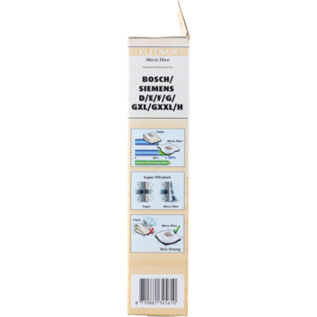 De Kleenair stofzuigerzak Bosch/Siemens BS-7 5 stuks + 1 filter zijn gemaakt van microvezel. Stofzakken gemaakt van microvezel zijn steviger en filteren beter dan de papieren stofzuigerzakken. Ook blijft er meer zuigkracht over doordat er minder krachtverlies is door de microvezel.