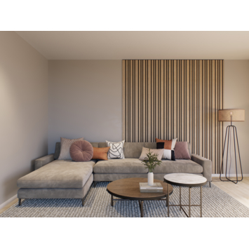 Met het kleurstaal van de lattenwand Decowall Acoustic Blend natuur eiken kan je thuis beoordelen of het wandpaneel past bij jouw huis en inrichting. Het kleurstaal hoort bij het paneel lattenwand 260x30cm (artikel 296740)