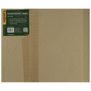 Met het kleurstaal van de lattenwand Decowall Acoustic eiken kan je thuis beoordelen of het wandpaneel past bij jouw huis en inrichting. Het kleurstaal hoort bij het paneel lattenwand 260x30cm (artikel 263622)