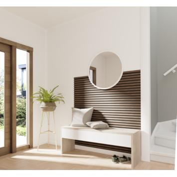 Met het kleurstaal van de lattenwand Decowall Acoustic walnoot kan je thuis beoordelen of het wandpaneel past bij jouw huis en inrichting. Het kleurstaal hoort bij het paneel lattenwand 260x30cm (artikel 263623)