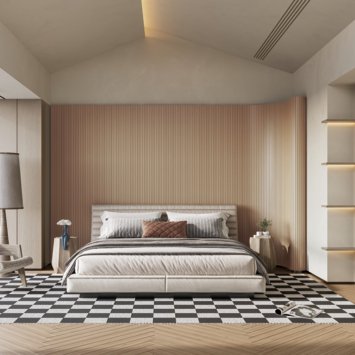 Als interieurstylist kom ik een hoop materialen tegen, maar deze panelen blijven uniek. Om de babykamer een enorme cosy sfeer boost te geven, heb ik ervoor gekozen om de walnoot panelen ook tegen het plafond te plaatsen.