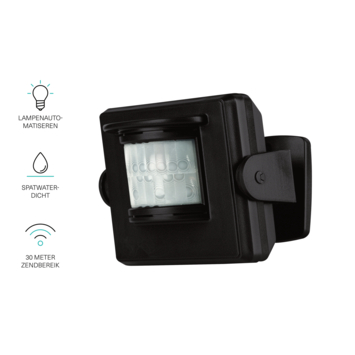 De draadloze bewegingsmelder is spatwaterdicht. Daardoor is hij heel gemakkelijk in gebruik binnenshuis én buitenshuis. De bewegingsdetectiemelder is buitenshuis te monteren, zonder installatiedraden. De zender werkt namelijk op batterijen. Met het meegeleverde bevestigingsmateriaal plaatst je de melder vervolgens op een gewenste positie. Zodra er beweging waargenomen wordt, schakelt de melder automatisch 1 of meerdere Klik Aan Klik Uit ontvangers naar keuze aan. Nadat er geen beweging meer wordt gedetecteerd wordt de verlichting automatisch weer uitgeschakeld (instelbaar op 5 seconden, 1, 5 of 10 minuten). Het bereik binnenshuis is maximaal 30 meter, buitenshuis zelfs 70 meter. De sensor heeft een compacte en strakke vormgeving, waardoor hij perfect in elk interieur past. Het signaal gaat zelfs door vloeren, wanden en deuren.