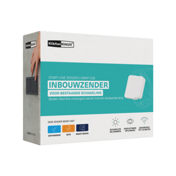 Wanneer je met de wandschakelaar de lamp aanzet, stuurt de inbouwzender een aan-signaal naar één of meer Klik Aan Klik Uit-ontvangers. Zo kunt je bijvoorbeeld tegelijkertijd 2 schemerlampen draadloos inschakelen. Wanneer je met de wandschakelaar de aangesloten verlichting uitschakelt, zent de inbouwzender een uit-signaal naar de KlikAanKlikUit-ontvanger(s). De AWMT-230 mini-inbouwschakelaar is geschikt voor verlichting met een maximaal wattage van 230watt. Deze inbouw zender is alleen te gebruiken met een standaard wandschakelaar en is niet te gebruiken met een pulsschakelaar, hotelschakeling of wanddimmer.