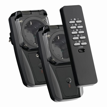 De set bestaat uit twee stopcontactschakelaars en een afstandsbediening.