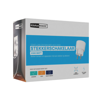 De KlikAanKlikUit stekkerdoos schakelaar ACC-2300 met randaarde kun je in een stopcontact steken om een lamp of apparaat aan te sluiten die je dan draadloos kunt in- en uitschakelen met 1 tot maximaal 6 Klik Aan Klik Uit zenders, zoals een afstandsbediening en draadloze wandschakelaar. Deze witte stekkerdoos schakelaar heeft een maximum belastbaar vermogen van 2300 watt. De schakelaar is door zijn kinderbeveiliging ook veilig. Daarnaast heeft hij een draadloos bereik op de zender van 30 meter. Hierdoor kan jij bijvoorbeeld vanaf de bank je verlichting bedienen met je afstandsbediening (niet meegeleverd).