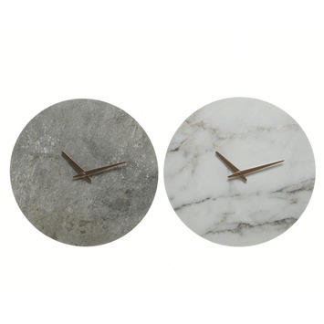 Deze klok heeft een industrieel design en is een echte eyecatcher in een kamer. Verkrijgbaar in de kleuren grijs en wit. Klok mdf marmer wit of grijs heeft een afmeting van 33,8x33,8x4 cm.