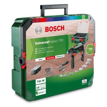 De Bosch klopboormachine UniversalImpact 700 is een compacte en ergonomische klopboormachine. De klopboormachine weegt 1.7 kg, waardoor hij makkelijk te hanteren is. Met de toerental instelling kun je de klopboormachine perfect afstellen op het materiaal waarin je boren moet. Over terugslag hoef je ook niet in te zitten, want de machine is uitgerust met Kick-Back control. Door de snelspanboorkop kun je makkelijk en zonder gereedschap van boor wisselen. De Bosch klopboormachine UniversalImpact 700 is inclusief dieptestop, additionele handgreep & 182 delige accessoireset in stevige systembox. De machine heeft een vermogen van 700 watt.