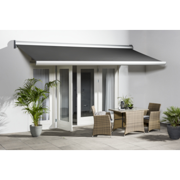 Het knikarmscherm Staccato is ook verkrijgbaar in breedte 300 cm met een uitval van 250 cm en in breedte 500 cm met een uitval van 300 cm met bedieningszijde links of rechts.