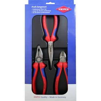 Drie-delige tangenset bestaande uit: combinatietang, zijsijtang en radiotang. Met tweekleurige meer-componentengrepen. ,Koppen gepolijst.
