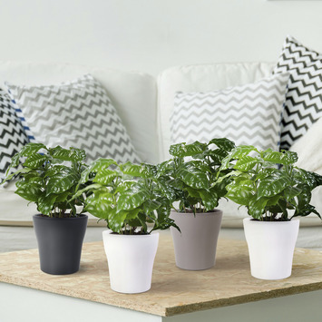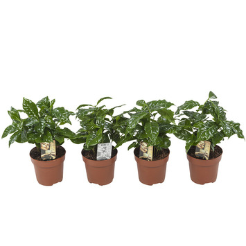 De Coffea Arabia, ofwel ‘Bergkoffie uit Ethiopië’ was de eerste koffieplant die door de mens werd geteeld. De plant draagt mooie glimmende bladeren. Hij wordt geleverd per vier stuks. De planten zijn 25 centimeter hoog per stuk en hebben een potmaat van 12 centimeter. Na vier jaar krijgt de plant mooie, witte zoetgeurende bloemen. In Nederland is de plant nog redelijk onbekend. Dus ga jij voor een originele plant in huis? Kies dan voor deze leuke Coffea Arabia.